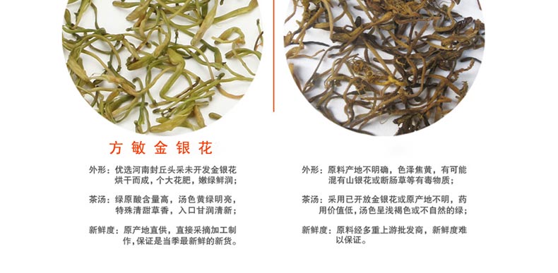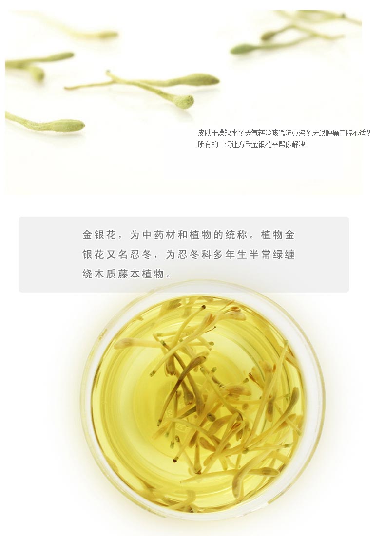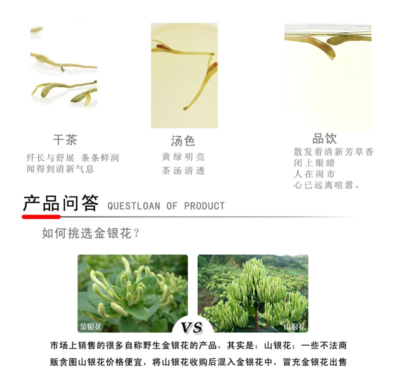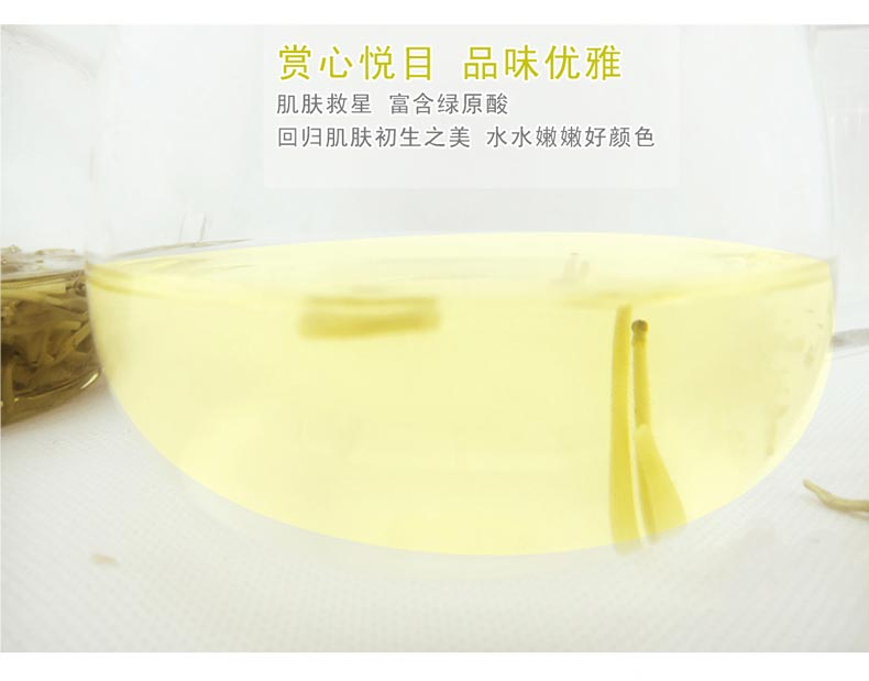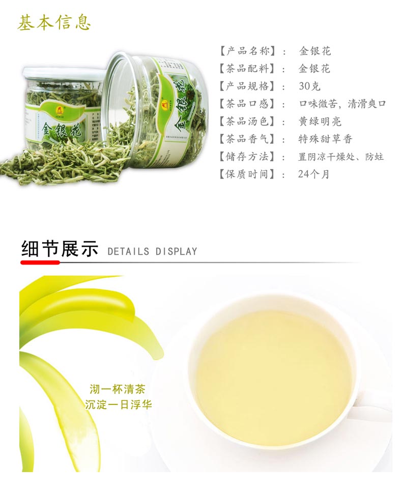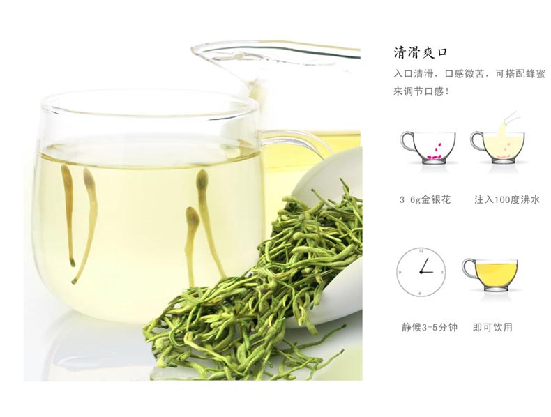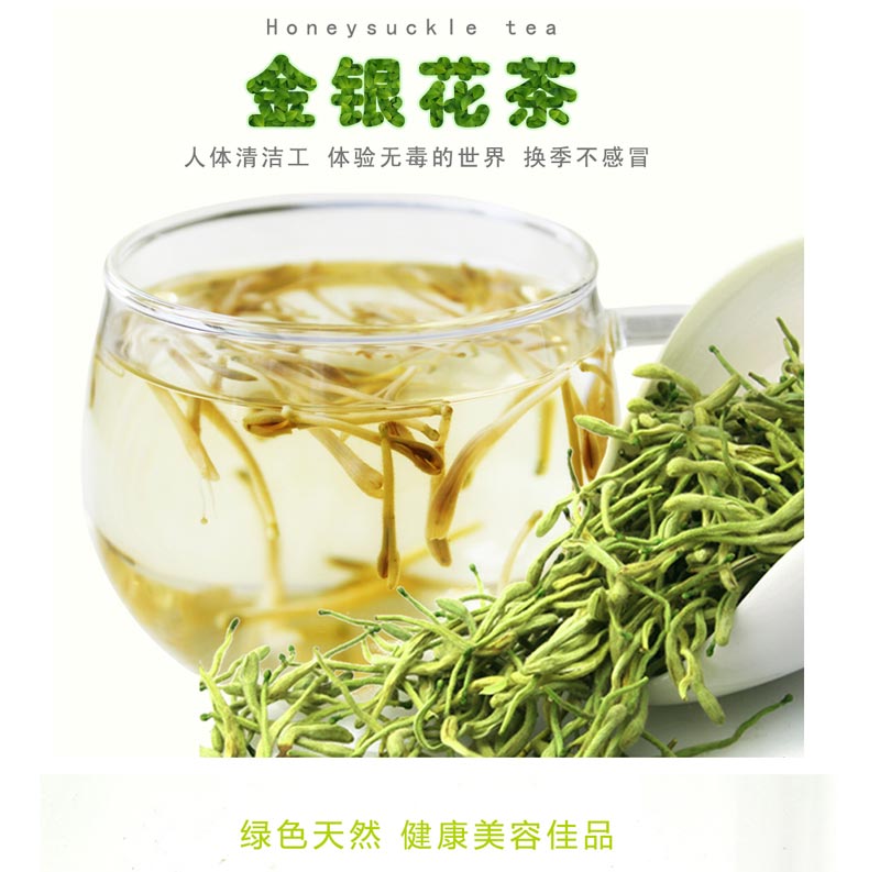 金银花茶有两种,即是金银花的成品。市场上的金银花茶有两种,一种是鲜金银花与少量绿茶拼和,按金银花茶窨制工艺窨制而成的金银花茶;另一种是用烘干或晒干的金银花干与绿茶拼和而成。这两种金银花茶,前者花香扑鼻,以品赏花香为主;后者,茶香味较低,但可保持金银花的药效作用,不失其保健效果。金银花茶是老少皆宜的保健饮品,特别是夏天饮用更为适宜。金银花品种较多,常见的有红金银花Lonicerajaponica(v