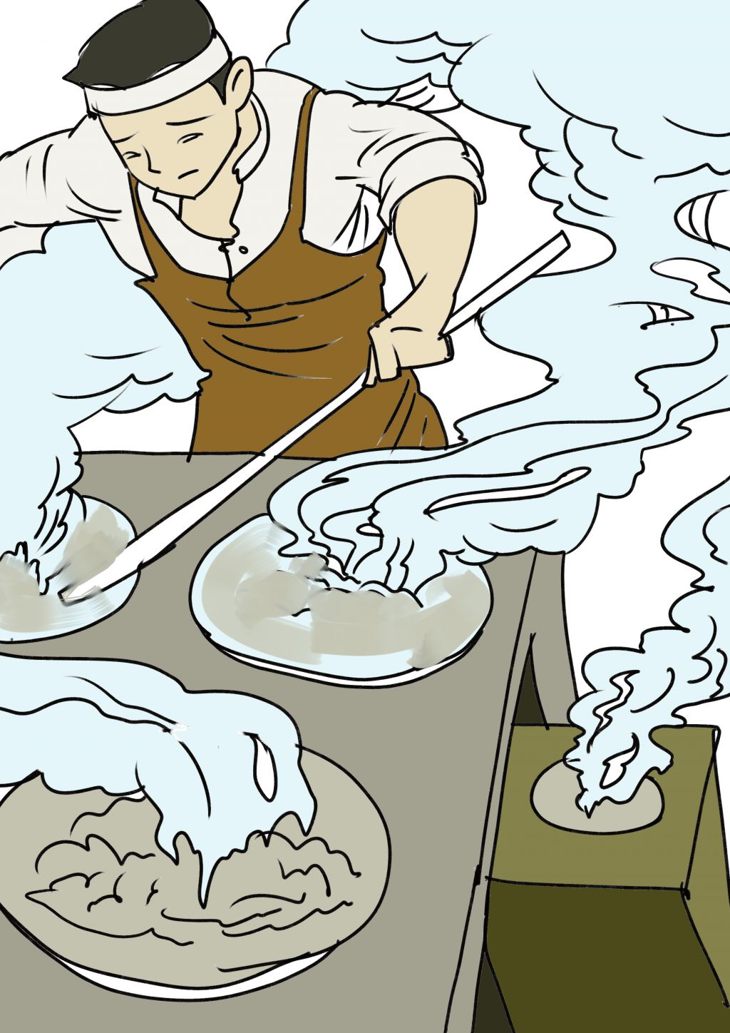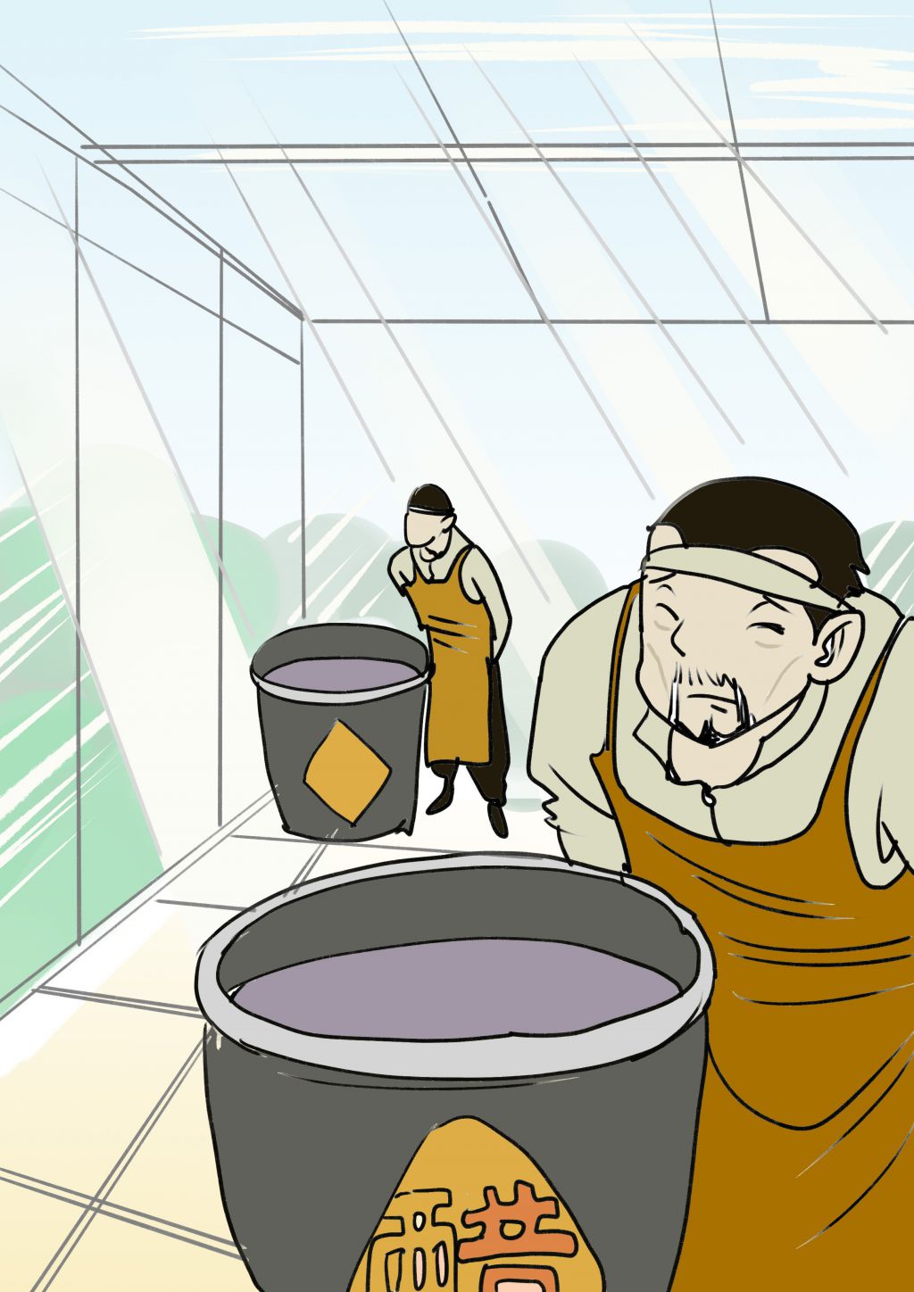 原料蒸熟期间加入大曲,蒸熟后,从蒸锅里转移材料,推开冷却之后加入辅料。在宽敞的发酵车间里,整整齐齐的大缸盛着正在发酵的原料。在发酵期间内,原料会产生高温,自行发酵,从表面看,不停地翻滚着一个个气泡。原料需要发酵十五天。期间,酿造师傅们要不停的翻动,以保证所有的原料都能充分接触氧气。